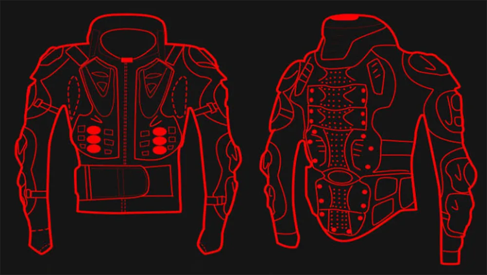 Высокопрочные композиты: верхняя броня для езды на мотоцикле, разработанная для выдерживания высокоскоростных ударов. Поглощение энергии в виде сот: специальная внутренняя структура, предназначенная для рассеивания кинетической энергии по поверхности, сводя к минимуму локализованные травмы. Полная защита: стратегическая защита плеч, локтей, груди и спины.
